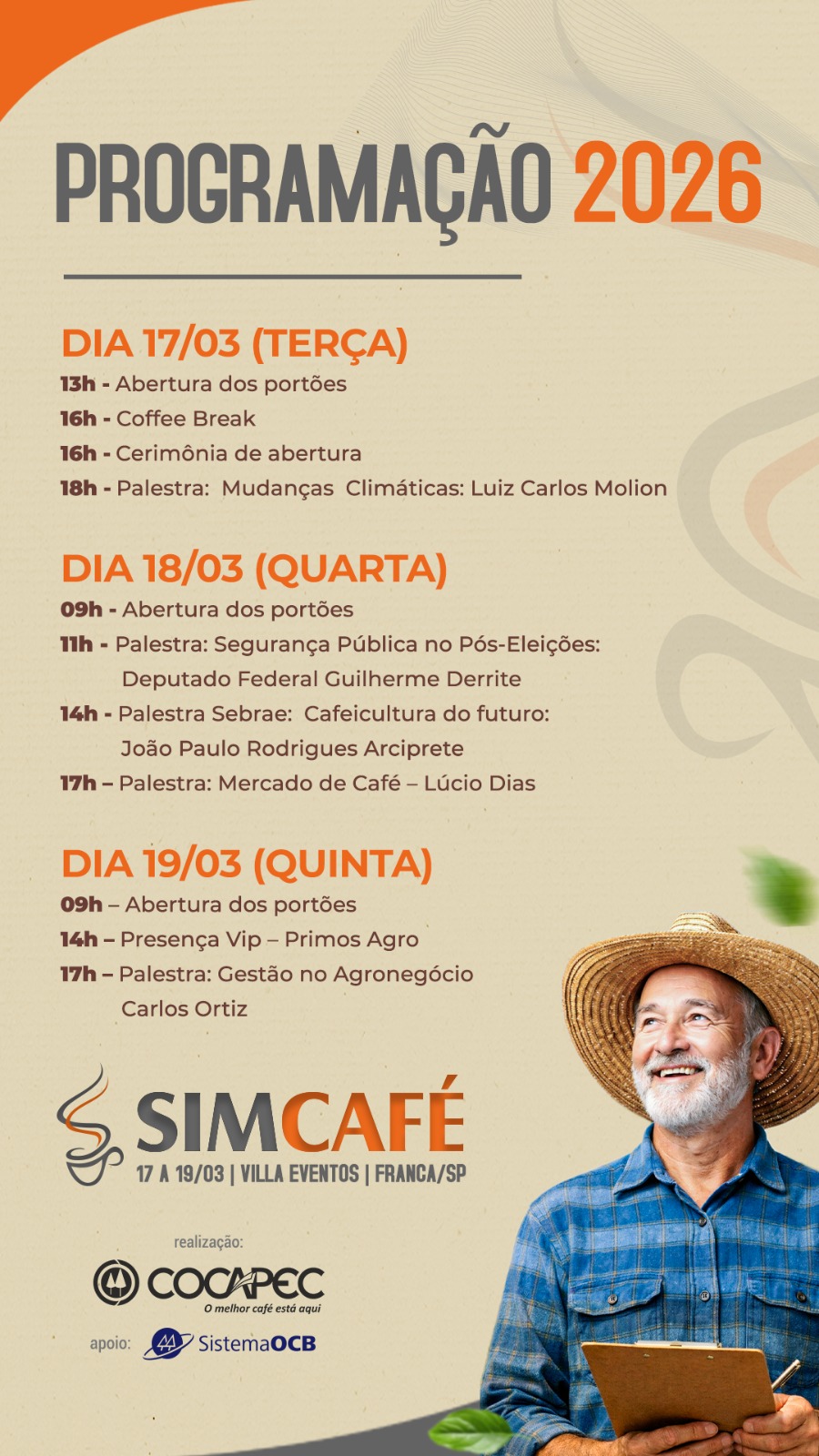 A programação inclui palestras com especialistas e convidados, abordando temas relevantes como mercado de café, tendências climáticas, gestão na cafeicultura, sustentabilidade e segurança no agronegócio. Entre os destaques está a participação do meteorologista Luiz Carlos Molion, além de outros profissionais que trarão análises e perspectivas importantes para o produtor rural.