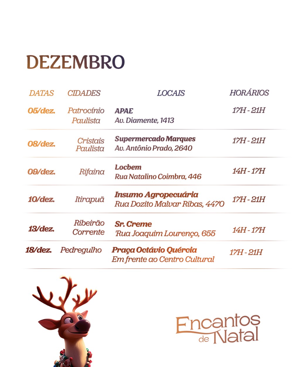 Além da Casa do Papai Noel fixada no Centro, a ACIF preparou ações itinerantes pelos bairros de Franca e cidades da região, conforme o cronograma a seguir: