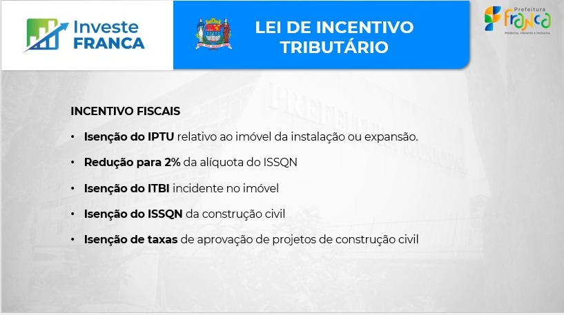 O projeto de Lei que prevê a criação do programa Investe Franca – que será protocolado hoje na Câmara Municipal para que seja pautado - prevê incentivos como isenção de IPTU, redução do ISSQN e isenções de ITBI, ISSQN da construção civil e taxas de aprovação de projetos.